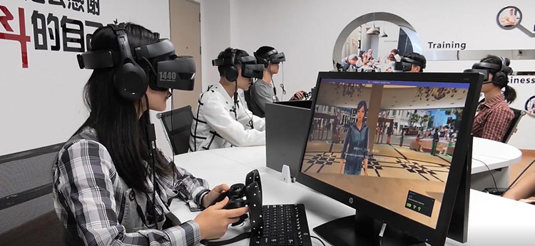 在VR实训教室中,学生可以身临其境地在教学场景中学习交流,模拟空间内学生的听觉、视觉即时同步,语境更加具象,可增强教学记忆点,有效强化英语语感;