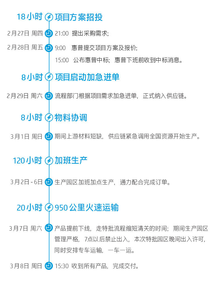 产品从生产到下线一般至少需要7个工作日,清关流程需要至少24小时。惠普重庆工厂距离该集团总部约950公里,平时专车最快要走20个小时。由于当时工厂不能全面复工,且上游材料严重短缺,生产力非常有限;并且全国进行交通管制,物流受到大面积影响,运输比以往需要更长时间。在如此巨大的压力之下,惠普商用电脑各部门通力合作,争取最大化加快生产流程、缩短清关时间,最后提前24小时圆满完成任务,顺利交付所有产品。
